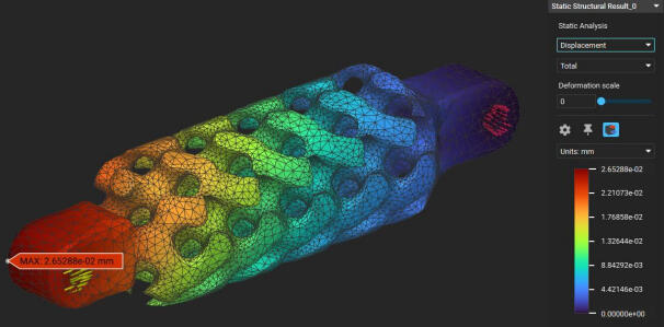 Advanced Analysis: Performed static analysis using nTop platform on the final TPMS lattice design under realistic load conditions, showcasing proficiency in simulation tools and understanding of material properties (AlSi10Mg).